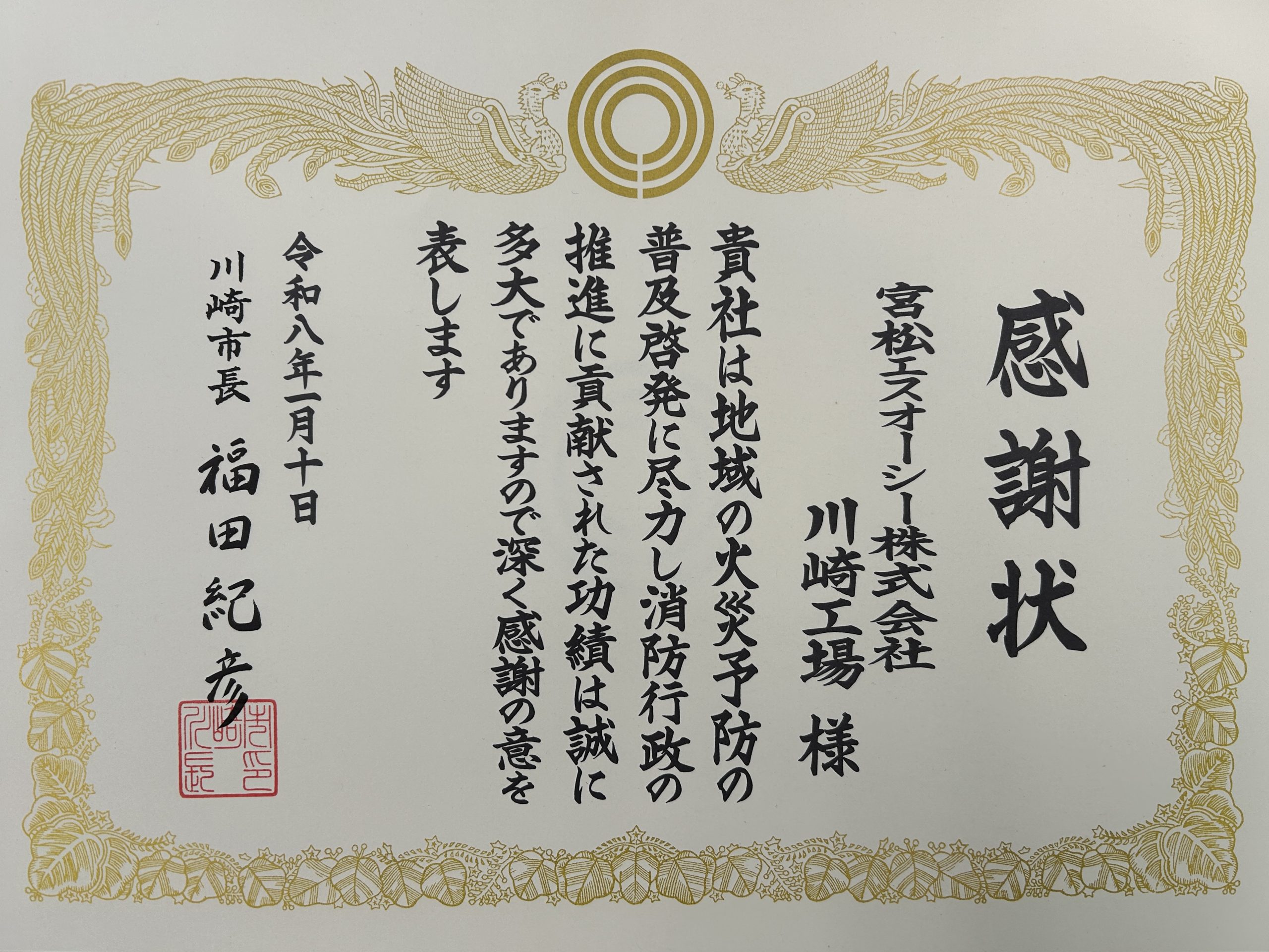 2026年1月10日の中原地区消防出初式において、当社川崎工場が「一般市民特別消防協力団体」として川崎市長より感謝状を授与されました。これは、川崎工場で昨秋から実施しているプラント壁面への「火の用心」などの夜間投影の取り組みを評価していただいたものです。