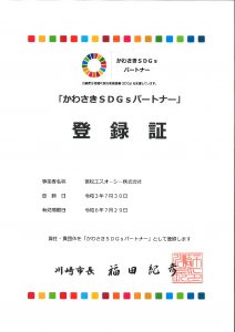 弊社は、SDGsの達成に向けて取り組む企業を公募する川崎市の登録認証制度「かわさきSDGsパートナー」に応募しました。申請書には弊社の経営方針およびSDGsに関する取組内容、具体的には低CO2川崎ブランド2016大賞を受賞した「こんじゃりコン」の製造やリサイクル品を地域の皆様に無償提供している活動を記載しました。その結果、7月30日付で認証登録されました。